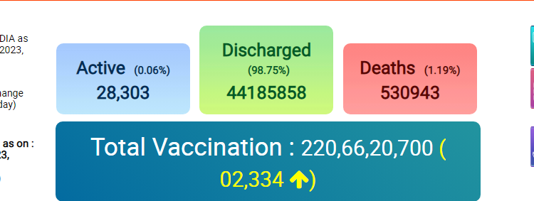 स्वास्थ्य मंत्रालय ने जानकारी देते हुए बताया है कि अब तक कोविड-19 के कुल 4,47,22,605 मामले दर्ज किए गए हैं। जिसमें से 4,41,85,858 मरीज कोरोना से स्वस्थ्य हो चुके हैं। कोरोना से मरीजों के स्वस्थ होने की दर 98.77 प्रतिशत है। अब तक कोरोना संक्रमण से कुल 5,30,943 लोगों ने अपनी जान गंवाई है।