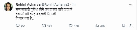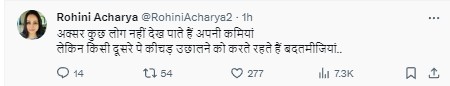 हालांकि उन्होंने जेडीयू का तो एक बार फिर नाम नहीं लिया लेकिन ये पूरा बयान आरजेडी के लिए माना गया। बिहार के हल्को में ये बाते चलने लगी की नीतीश कुमार ने आरजेडी को लेकर ही ये बातें बोली है। आरजेडी की तरफ से स्पष्टीकरण भी आने लगे। उन्होंने नीतीश के बयान का बचाव किया। लेकिन अब लालू यादव की बेटी रोहिणी ने भी बिना नाम लिए नीतीश कुमार पर निशाना साधा है। रोहिणी ने सोशल मीडिया पर पोस्ट करते हुए लिखा कि ‘समाजवादी पुरोधा होने का करता वही दावा है,हवाओं की तरह बदलती जिनकी विचारधारा है..’ अपनी अगली पोस्ट में रोहिणी लिखती हैं, ‘खीज जताए क्या होगा, जब हुआ न कोई अपना योग्य विधि का विधान कौन टाले,जब खुद की नीयत में ही हो खोट.’ इसके अलावा अपनी पहली पोस्ट में रोहिणी ने लिखा, ‘अक्सर कुछ लोग नहीं देख पाते हैं अपनी कमियां, लेकिन किसी दूसरे पे कीचड़ उछालने को करते रहते हैं बदतमीजियां..’ रोहिणी की इस पोस्ट को लेकर कई तरह की अटकलें लगाई जा रही है और इसे अप्रत्यक्ष रूप से जेडीयू पर निशाने के रूप में भी देखा जा रहा है।