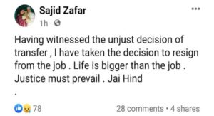 Ranchi : राज्य सरकार ने 151 डीएसपी रैंक के अधिकारियों का तबादला किया। इस लिस्ट में डीएसपी खोरी महुआ के पद पर पदस्थापित डीएसपी साजिद जफर को एसआईएसएफ डीएसपी बोकारो के पद पर पदस्थापित किया गया। इसके बाद उन्होंने बुधवार को सोशल साइट फेसबुक पर एक पोस्ट लिखा है। पोस्ट में कहा है कि स्थानांतरण के अन्यायपूर्ण निर्णय को देखकर मैंने नौकरी से इस्तीफा देने का निर्णय लिया है। जिंदगी नौकरी से बड़ी है। न्याय अवश्य मिलना चाहिए। जय हिन्द।