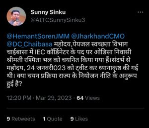 आज फिर मुख्यमंत्री हेमंत सोरेन को श्रीमती रश्मिता भल की नियुक्ति पर ट्वीट करने के बाद यह प्रतिक्रिया दी गई है। ट्वीट में मुख्यमंत्री आवास कार्यालय और उपायुक्त, प.सिंहभूम चाईबासा को सलग्न की गई है। चाईबासा प्रमंडल पेयजल व स्वच्छता विभाग में जब जिला के उच्चस्थ पदाधिकारियों का समिति गठन कर आई ई सी कॉर्डिनेटर के पद पर चयन प्रक्रिया पूर्ण करना था। तब भी झारखंड पुनरूत्थान अभियान के संयोजक की जिम्मेदारी से हमने 24 जनवरी 2023 को मुख्यमंत्री हेमंत सोरेन को इस चयन प्रक्रिया की ओर ट्वीट कर ध्यान आकृष्ट किया था। साथ में मुख्यमंत्री आवास और उपायुक्त, प.सिंहभूम चाईबासा को सलग्न भी की गई थी। लेकिन इसके बाद भी अंतिम रूप से चयन प्रक्रिया में IEC कॉर्डिनेटर के पद पर ओडिसा निवासी श्रीमती रश्मिता भल को चयन किया गया है। यह चयन प्रक्रिया कौन सा रोस्टर प्रणाली के आधार पर अंतिम रूप दिया गया? जिला प्रशासन इश्तहार निकालकर या उचित माध्यम से जिला के जनता के सामने सार्वजनिक करे। झारखंड पुनरूत्थान अभियान मांग करती है।झारखंड सरकार कहती है झारखंड में या अनुसूचित जिला में उसी जिला के वासगीत के आधार पर नियुक्ति प्रक्रिया पूर्ण की जाएगी। तो श्रीमती रश्मिता भल का वासगीत ओडिसा का होने के बाबजूद भी कैसे अंतिम रूप से चयनित हो पाई है? क्या कोल्हान के हमारे मंत्री, सांसद,विधायकगणों को इस चयन प्रक्रिया के बारे में जानकारी है? अगर जानकारी नहीं है तो क्या यह जिला के आला अधिकारियों का मनमानी नहीं है?