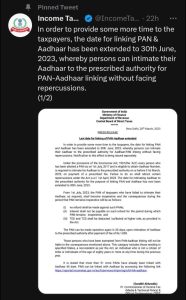 PAN – Aadhaar Link Extended : करदाताओं की सहायता के लिए, वित्त मंत्रालय की एक प्रेस विज्ञप्ति के अनुसार, आधार को पैन से जोड़ने की समय सीमा 31 मार्च, 2023 से बढ़ाकर 30 जून, 2023 कर दी गई है। उसके बाद, करदाता अपने पैन को अपने आधार से आसानी से लिंक कर सकते हैं। 1961 के आयकर अधिनियम के अनुसार, 1 जुलाई, 2017 तक, पैन प्राप्त करने वाले और आधार संख्या के लिए पात्र किसी भी व्यक्ति को 31 मार्च, 2023 तक कर प्राधिकरण के साथ उस संख्या को साझा करने की आवश्यकता थी।