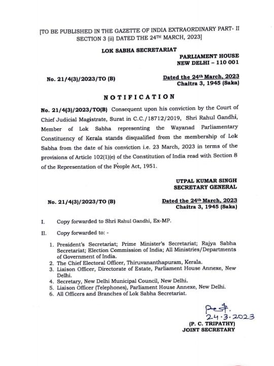 नई दिल्ली : कांग्रेस नेता राहुल गांधी को लोकसभा सदस्यता से हाथ धोना पड़ा है। शुक्रवार दोपहर करीब 2.30 बजे रद्द कर दी गई। वह केरल के वायनाड से लोकसभा सदस्य थे। लोकसभा सचिवालय ने पत्र जारी कर इस बात की जानकारी दी है।