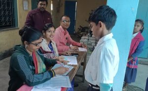 नैहाटी आनंद स्वरूप हिंदी हाईविद्यालय में वैक्सीनेशन के लिये कतार में खड़ीं बच्चियां व बच्चे