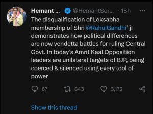 झारखंड के मुख्यमंत्री हेमंत सोरेन ने संसद सदस्य के रूप में राहुल गांधी को हटाने के लिए भाजपा की आलोचना की है। उन्होंने कहा कि भाजपा विपक्ष को कुचलने का प्रयास कर रही है। यह अमरता का युग नहीं है, बल्कि एक अत्यावश्यक स्थिति है।